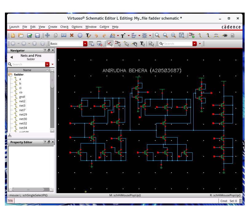 I draw the adder schematic using Virtuoso to perform binary addition operation of two bits, which are a and b with an input carry (ci). The delay measurements were performed, and they are found to be as expected value. Then we verified the SPICE netlist against the Verilog module (adder.v) to test the functionalities of the proposed adder. After successfully running ESP, I found to match (passed) and hence the functionalities of the adder were successfully verified.